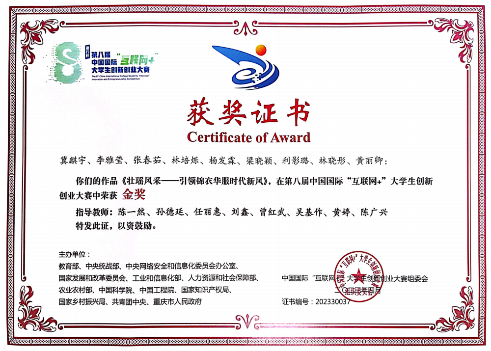 获中国国际大学生创新大赛金奖(壮瑶风采--引领锦衣华服时代新风)