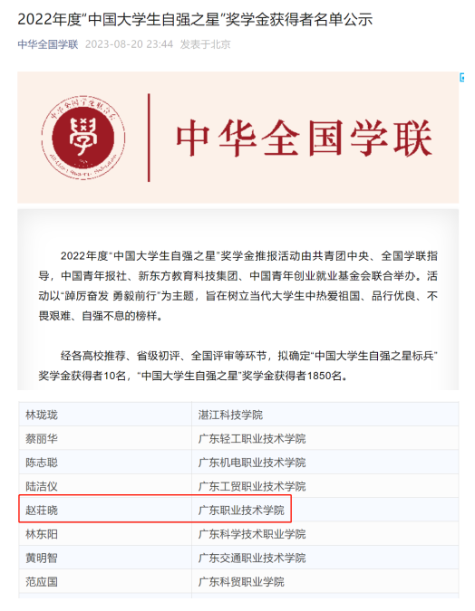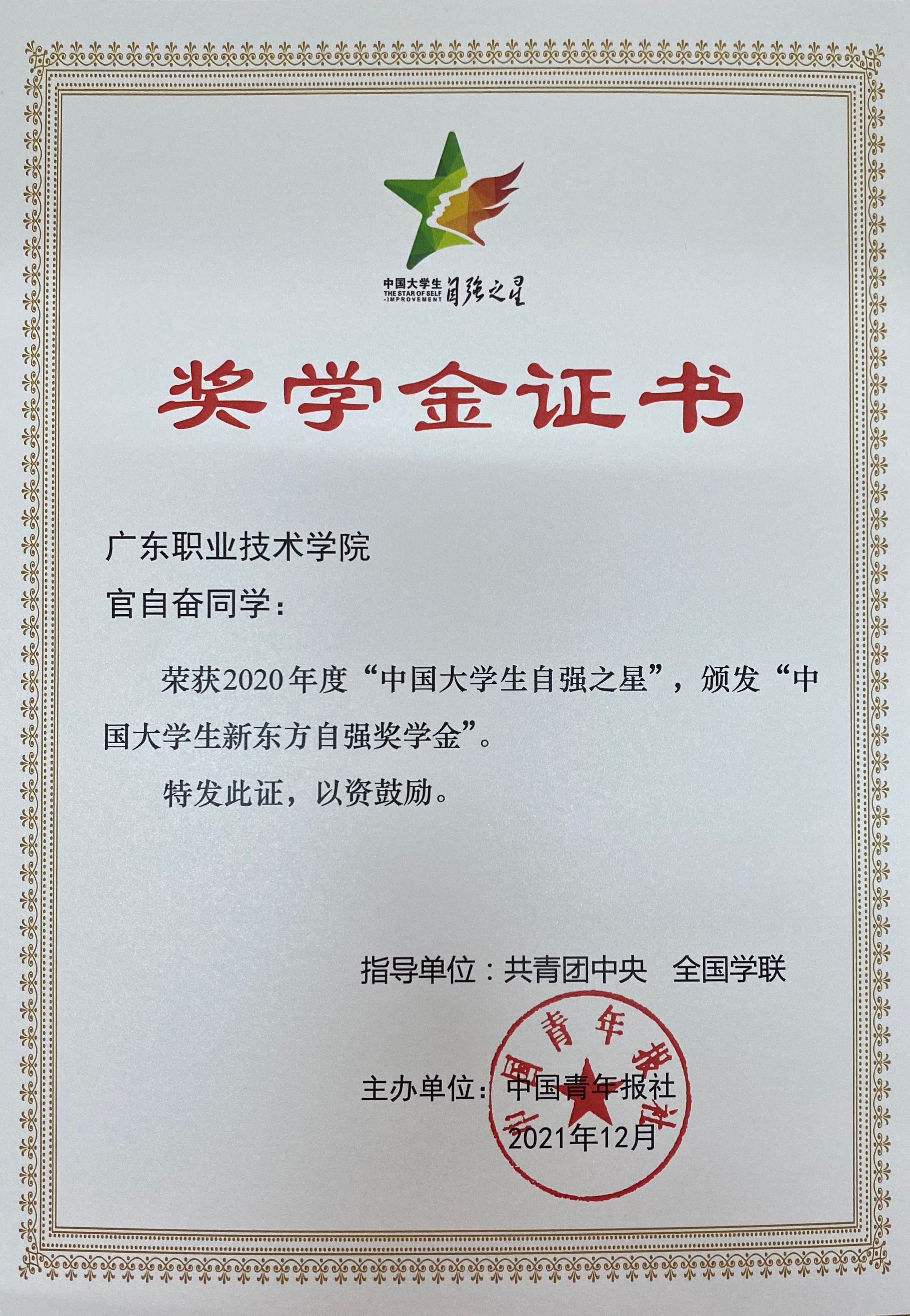 学生赵荘晓、官自奋获中国大学生自强之星