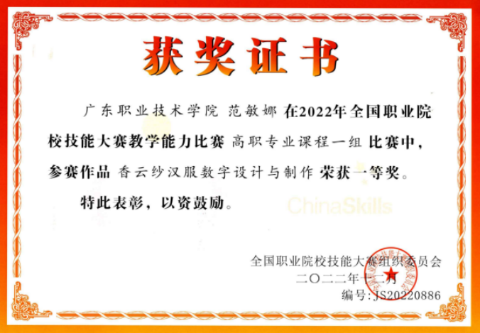 获全国职业院校技能大赛教学能力比赛一等奖(香云纱汉服数字设计与开发)
