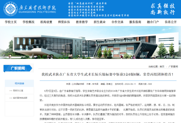 广东省大学生武术长短兵锦标赛:团体总分第一名,金奖3项,银奖6项,铜奖6项