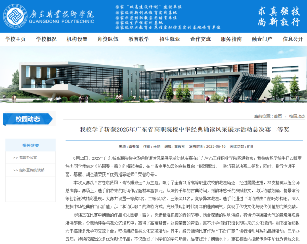 广东省高职院校中华经典诵读风采展示活动总决赛二等奖