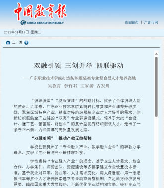 中国国教育报:双融引领三创并举四联驱动----广东职业技术学院打造纺解服装类专业复合型人才培养高地